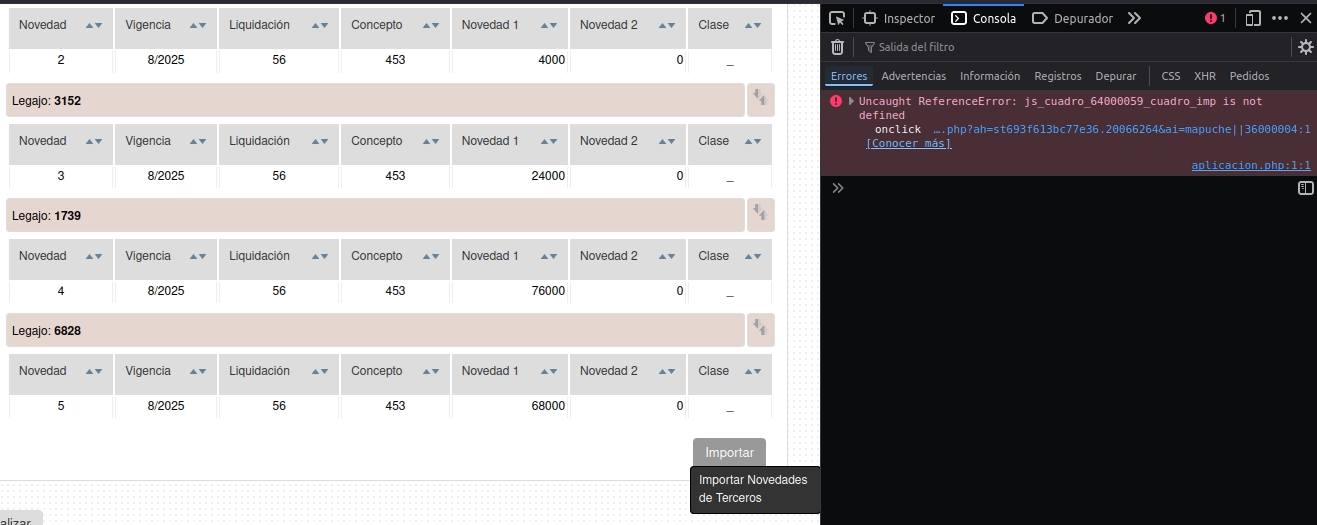 Se presiona el botón importar (no funciona y en la cabecera aparece seleccionar liquidación, sin poder hacerlo pues el select/combo queda inabilitado)