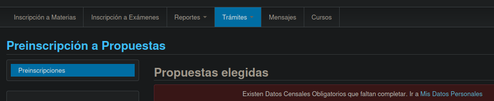Claro! Solo nos aparece el error cuando quieren redirigirse a “Mis Datos personales” desde el link porque desde la barra del menú anda bien y cuando volvés para finalizar el tramite de la preinscripción te deja finalizar bien.