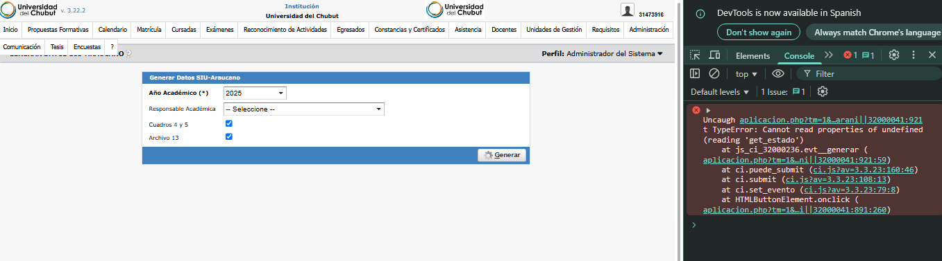 Probé la generación de archivos para araucano (nominal 2025) en una instalación con la versión desarrollo 3.22.2, actualizada (svn update), pero tengo un problema después de seleccionar el año académico y los tildes de cuadro 4 y 5, y el archivo 13: No se ejecuta nada al presionar el boton de “generar”.