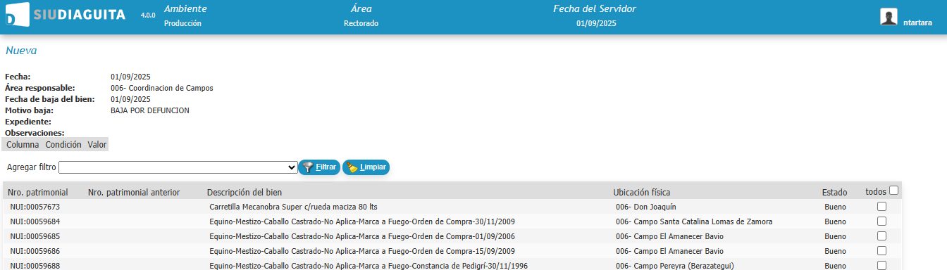 Adjunto captura de pantalla de filtro de bienes para tildarlos para su baja. Acá necesitaríamos que este a la vista el numero de serie