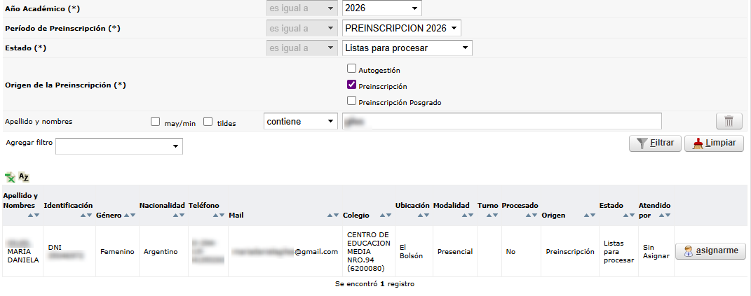 Un estudiante que contaba con usuario en gestión, pudo avanzar con la inscripción a propuesta desde el módulo de preinscripción, con misma nacionalidad, tipo y número de documento, pero diferente email.